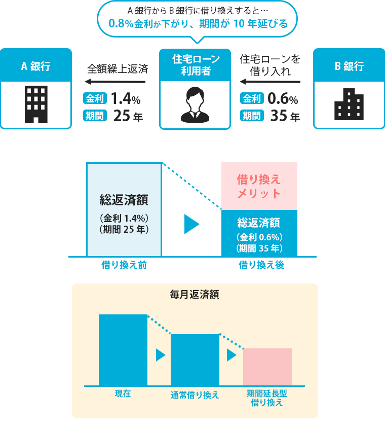 0.6%の金利のローンを返済期間35年で新たに借りて、返済期間25年の1.4%の金利のローンを全額繰上返済することで、ローンが1.4%の金利から0.6%の金利に引き下がり、かつ、返済期間が10年延長されることになります。