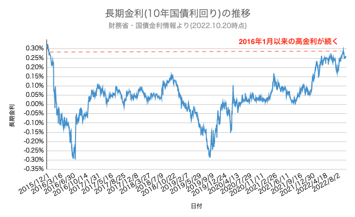 フラット35は「長期金利→機構MBS利率」という経路で金利が決定されていますが、指標となる長期金利は現在、2016年1月に日本銀行がマイナス金利政策の導入を決定して以来、最も高金利な水準で推移しています(図4)。