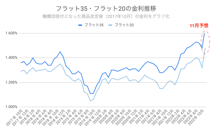 2022年11月は、フラット35の金利が1.64%、フラット20の金利が1.48%と、いずれも10月から0.16%の大幅上昇となることを予想します。