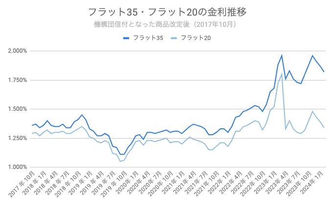 2024年2月のフラット35の金利は1.820%、フラット20は1.340%と、いずれも0.05%の低下を予想します。