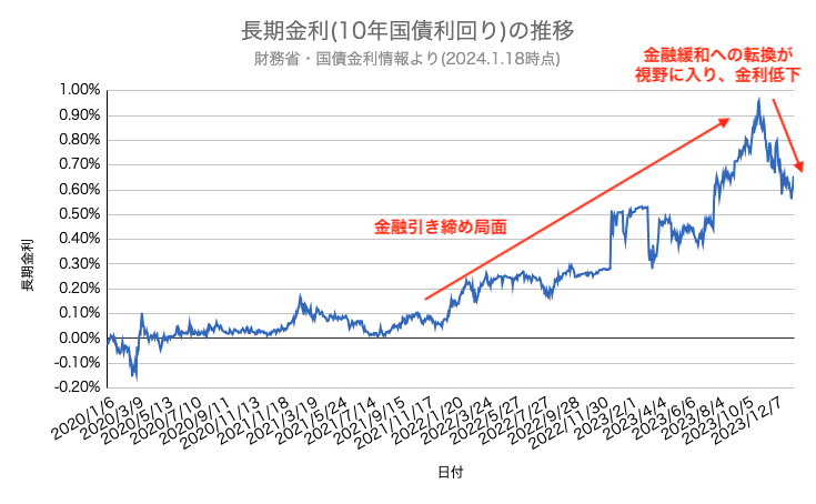 昨年日銀が相次いで金融緩和政策を修正した影響から長期金利(10年国債利回り)が上昇し、フラット35をはじめとする住宅ローン固定金利は上昇が続きました。しかし11月以降は米国・FRBの金融引き締めから緩和への転換が金利市場で意識され始め、日本の長期金利には低下圧力がかかりました。一時1.00%に迫った長期金利は足元では0.60%台まで低下しています。