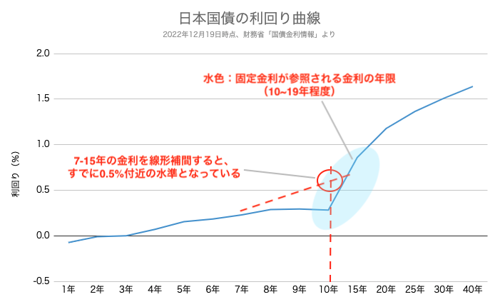 長期金利(10年)自体は日銀の政策によって0.25%付近に留まっていますが、15年など超長期の金利は1%近い水準となっています。しかし7年金利と15年金利の間をとって線形補間すると、0.5%程度となります。これは、「長期金利は日銀が抑えていたため実際には上がっていなかったものの、実態としてはすでに0.5%付近の状態になっている」と読み解くことができます。
