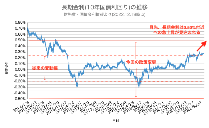 今回の政策決定で、この長期金利の変動幅を「±0.50%」へと拡大することとなりました。「±(プラスマイナス)」と上下に幅がとられていますが、現在は世界的な金利上昇局面であり、プラスの0.50%付近への急上昇が見込まれます。これは事実上の「利上げ」(金融環境の引き締め)となります。