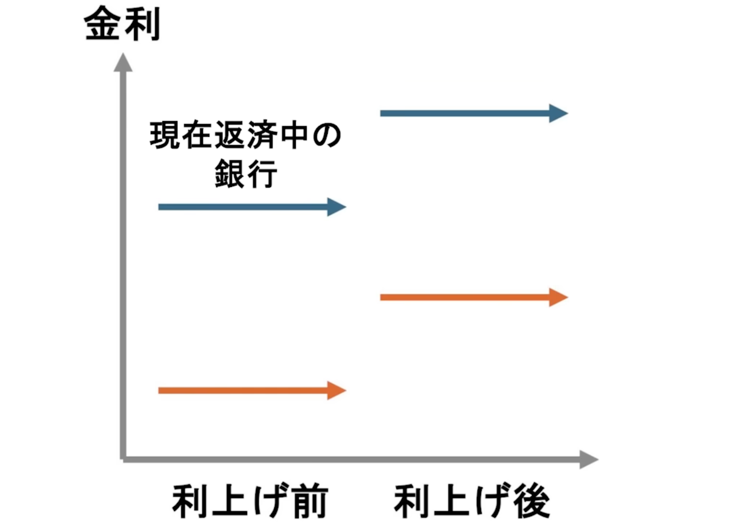 ですが、利上げがある場合は、今のローン金利も借り換え先の金利も一緒に上がるため、両者の差が縮まることはありません。