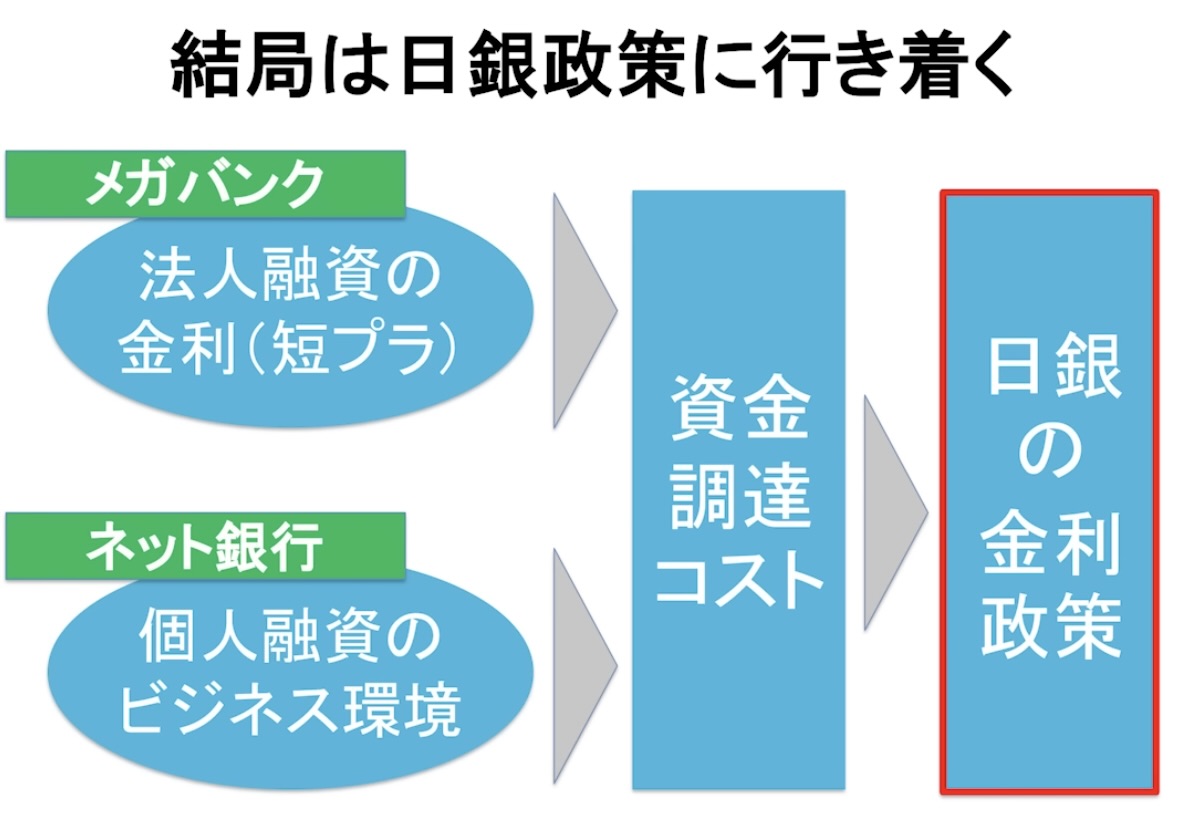 銀行のビジネスは大枠で共通していて、預金などで集めたお金を原資に、金利差(利ざや)を確保しながら貸し出すビジネスモデルです。なので、日銀の金融政策で金利環境が動くと、各銀行の金利も同じ方向に動きやすい。