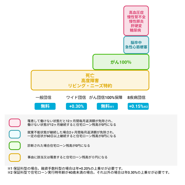 ほとんどすべての金融機関で、住宅ローン利用時には団信への加入が必須とされています。武蔵野銀行には、死亡時と高度障害時に保障が適用される一般団信の他に、「がん団信100%保障」「8疾病団信」「ワイド団信」が用意されています。
