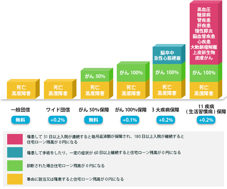 下記表の通り、一般団信、ワイド団信、がん50%保障、がん100%保障、3大疾病保障、11疾病(生活習慣病)保障があります。特にがん保障が充実しており、がん50%保障は無料付帯、がん100%保障は上乗せ金利0.1%で利用でき、さらに各種一時給付金が付いています。