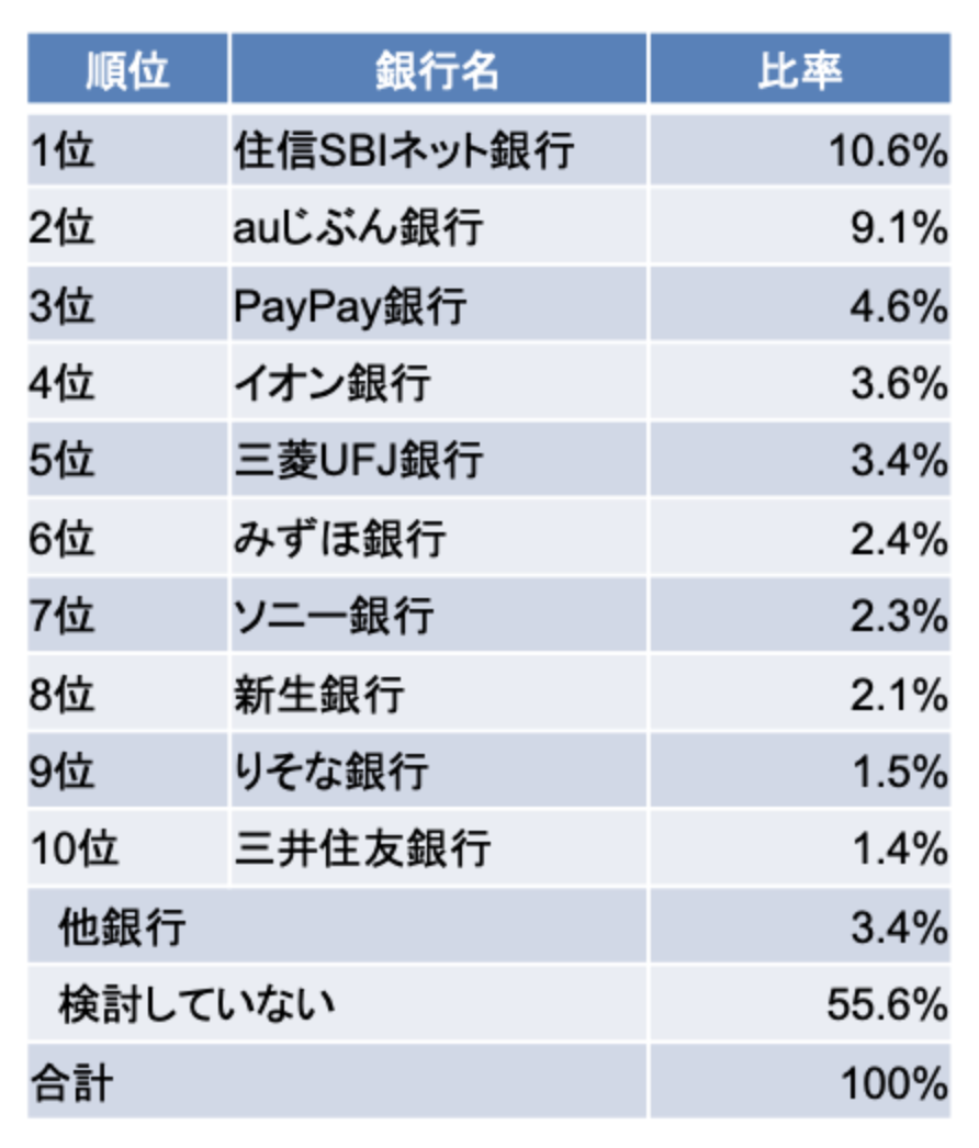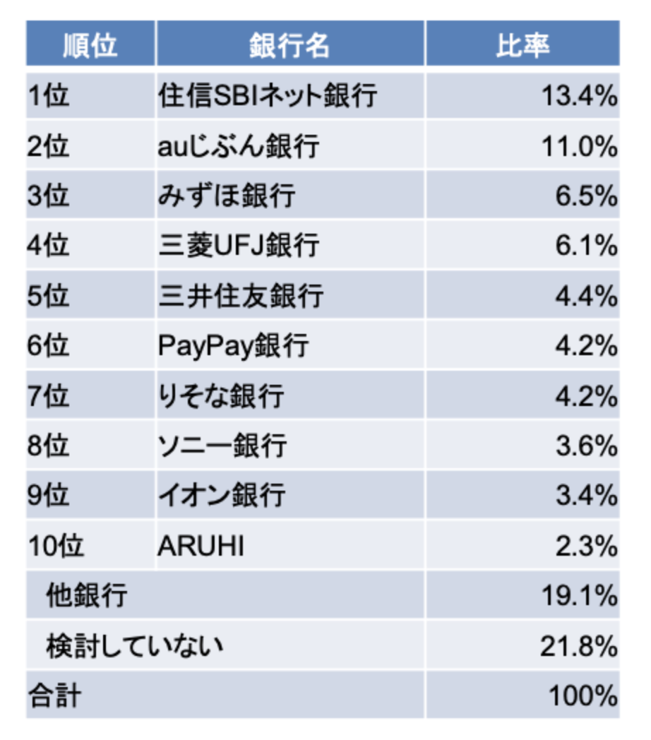 下記表の通り、住信SBIネット銀行とauじぶん銀行の2強となりました。なお、3位〜5位はメガバンクが占めています。メガバンクですが、金利面では上位2行に負ける銀行もあるものの、認知度が非常に高く、また不動産会社営業マンから紹介を受けるケースも多いため、上位に位置しているものと考えられます。