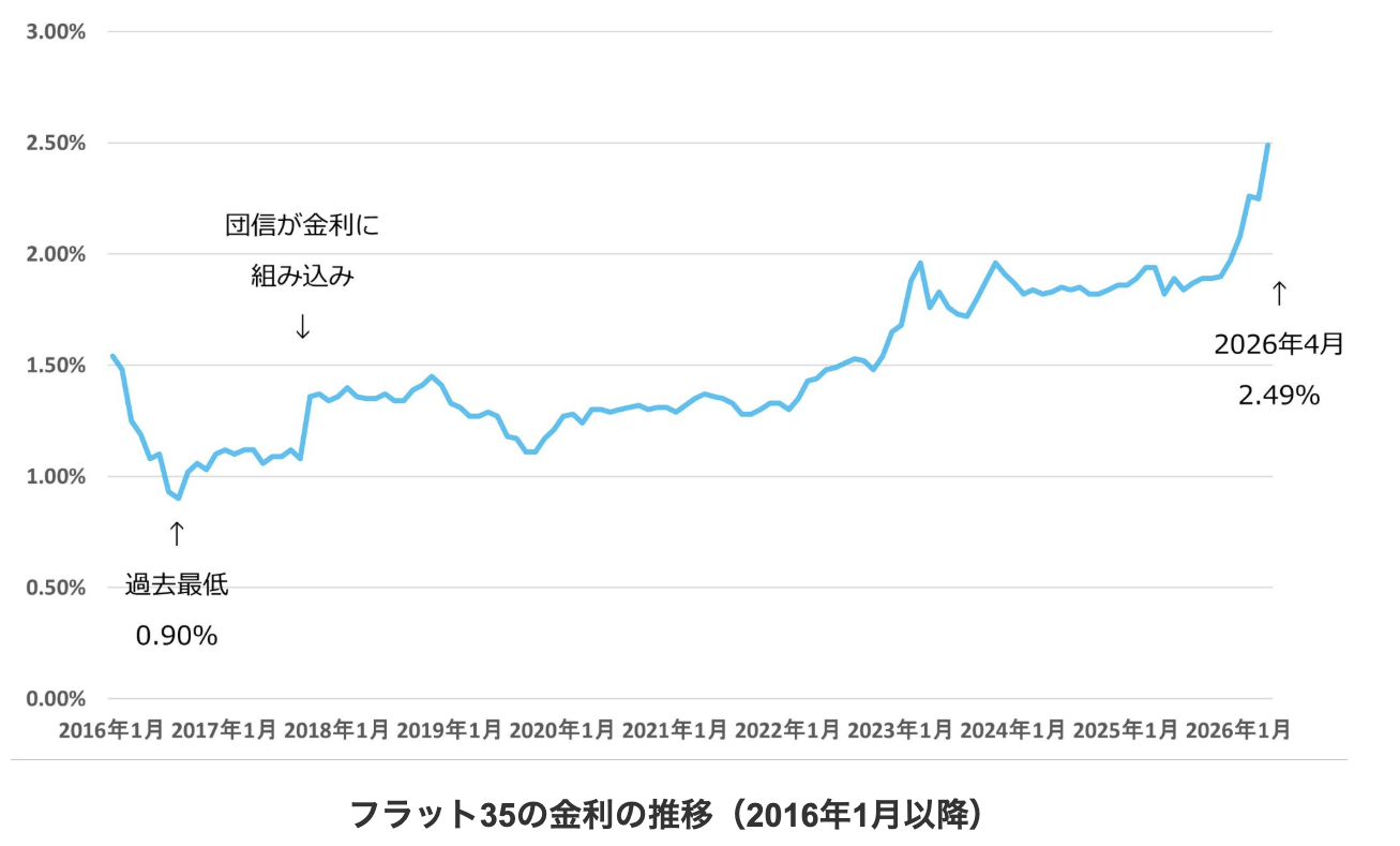 2026年4月時点では、融資率9割以下の最頻金利は2.49%ですが、融資率9割超ではこれよりも高い金利が適用されます。