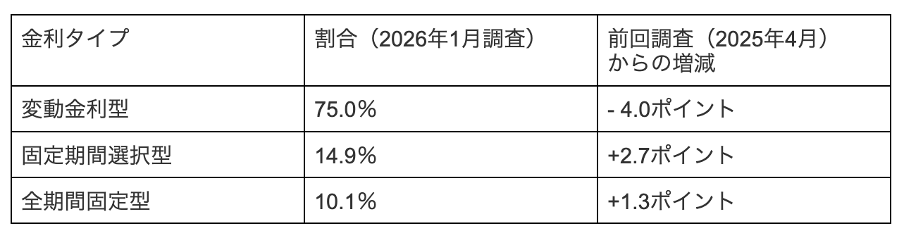 しかし、固定金利(固定期間選択型+全期間固定型)の合計は25.0%に達し、前回調査から4.0ポイント増加しました。