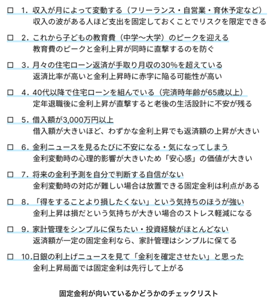 自分がいくつ当てはまるか数えてみて、複数が当てはまるようなら固定金利で借りることも検討してみましょう。