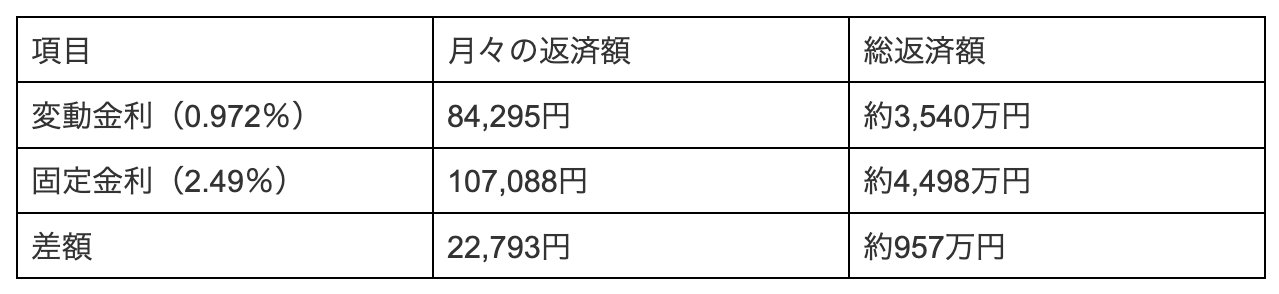 2026年4月時点で、借入額3,000万円・35年ローンの場合、変動金利の平均的な水準(0.972%)と全期間固定金利(フラット35・2.49%)の月々の返済額の差は約22,800円です。