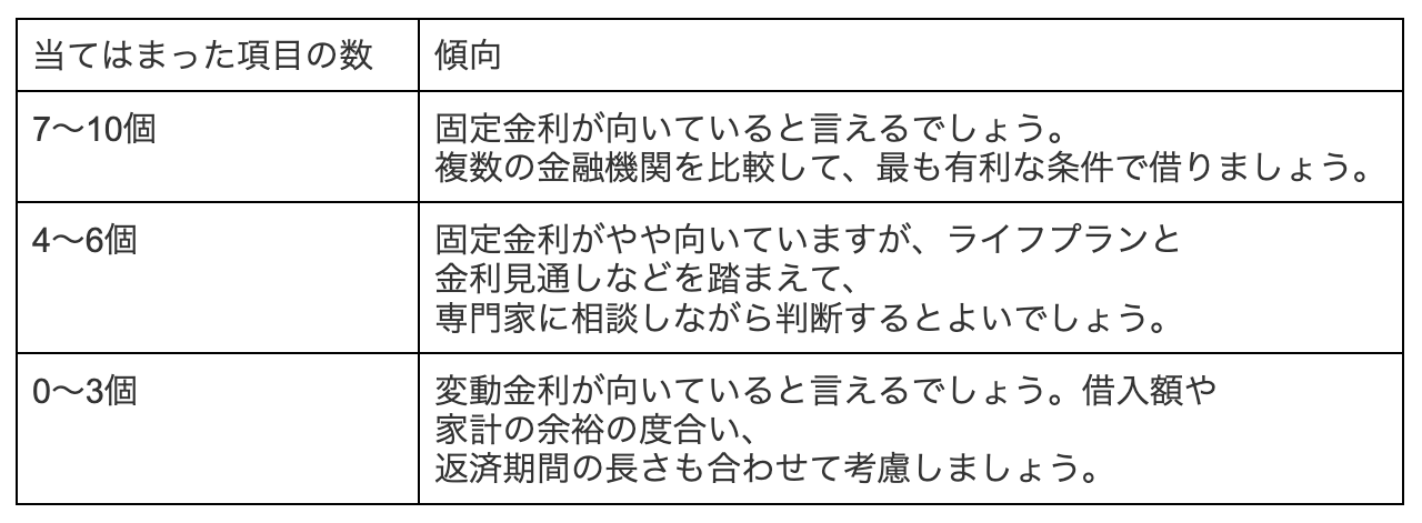 当てはまった項目の数によって、固定金利が向いているかどうかの目安がわかります。
