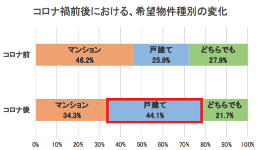 希望物件種別では、戸建てを希望する人が25.9%から44.1%へと20%近くの大幅な増加となりました。