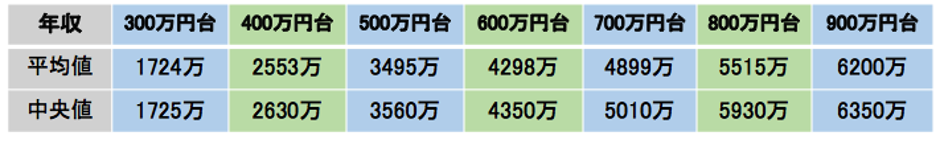 具体的には、300万円台で5.8倍、400万円台で6.6倍、500万円台で7.1倍、600万円台で7.3倍、700万円台で7.2倍、800万円台で7.4倍、900万円台で7.1倍となりました。