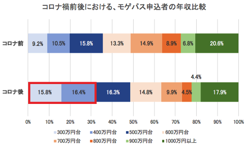コロナ禍以後には300万〜400万円の年収層の「モゲパス」申し込み割合が特に増加し、この層で住宅購入に積極的な人が増えていることがわかりました。