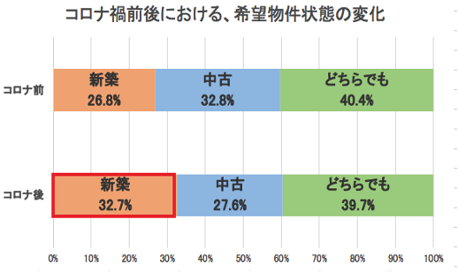 また、希望物件状態では、新築を希望する人が26.8%から32.7%へと5.9%増加しました。テレワークが普及し始め、自宅で仕事のためのスペースを確保したいという需要が出てきていることや、価格の高い駅近や都心部のマンションよりも、価格も抑えられ広い住戸も多い郊外の戸建てに住みたいというニーズが高まっていることが伺えます。