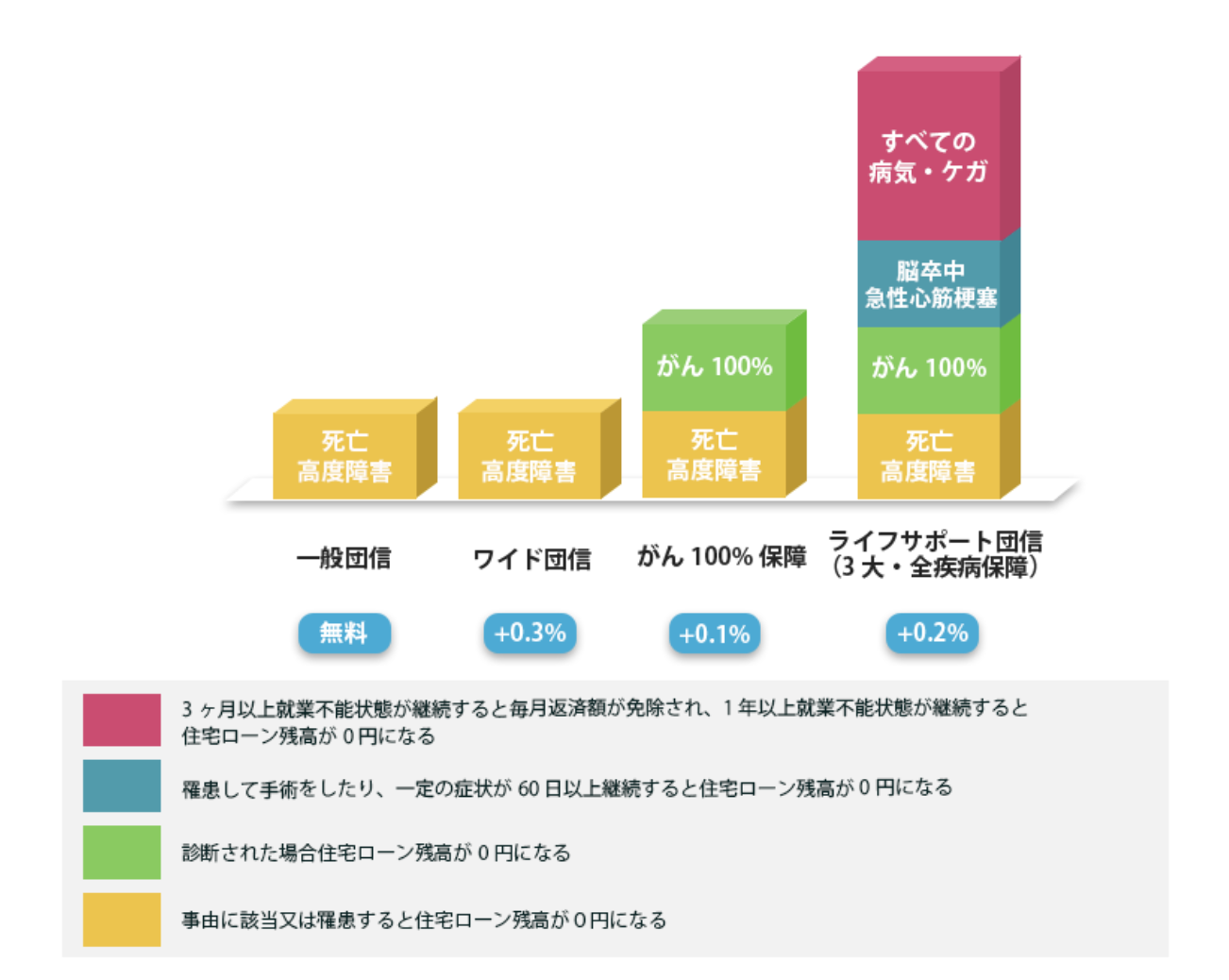 | 一般 | ワイド団信 | がん100% 保障 | ライフサポート団信(3大疾病保障+全疾病保障) | |