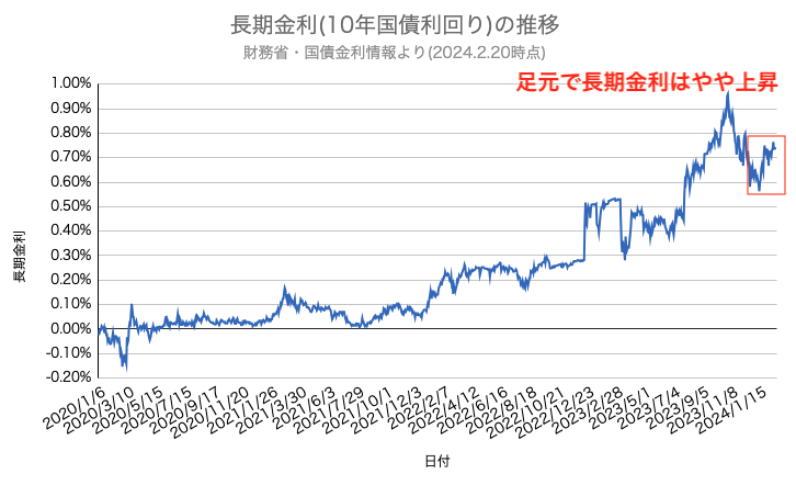 米国・FRBの早期の利下げ期待(政策金利の引き下げ)がやや後退する中、2月は日本の長期金利(10年国債利回り)が上昇しました。今回発表された機構MBS利率はこうした長期金利の影響を受けており、低下トレンドは一服となります。