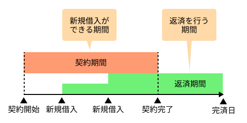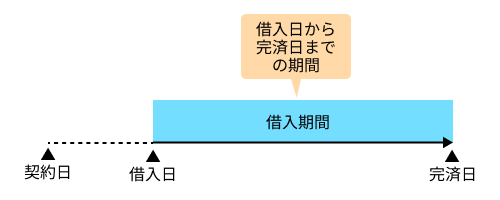 住宅ローンや不動産投資ローン、自動車ローンなどの一般的なローンや、事業性の融資などでは、完済日が確定しています。このとき、借入日から完済日までの期間を「融資期間」といいます。つまり、融資期間と借入期間の意味は同じです。
