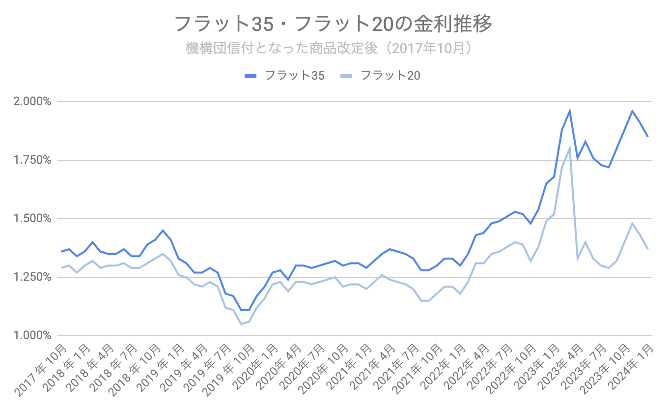 2024年1月のフラット35の金利は1.850%、フラット20は1.370%と、いずれも0.06%の低下を予想します。