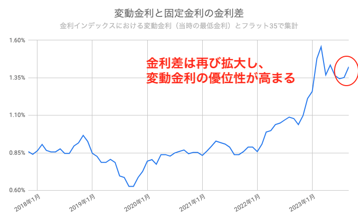 上述の金利インデックスから、最安の変動金利とフラット35の金利差をとったグラフが以下です。今月は固定金利が大きく低下したものの、変動・固定では金利水準が大きく異なるため、1.4%を超える金利差となっています。これは毎月返済額で約2.3万円、総返済額で約980万円も差がつく大きな差(借入額3,500万円、35年返済の場合)です。