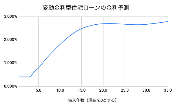 このグラフから、変動金利は今から5年後頃から上昇し、20年後に2.7%程度まで到達する可能性があると読み取れます。ただし、流動性の高い日本国債の利回りからこの予測を行っていることもあり、その時々の金融市況や景気動向によって大きく変化する可能性もあります。将来の金融政策や国内外の景気変動の影響を大きく受けるため、あくまで参考程度と捉えておくのがいいでしょう。