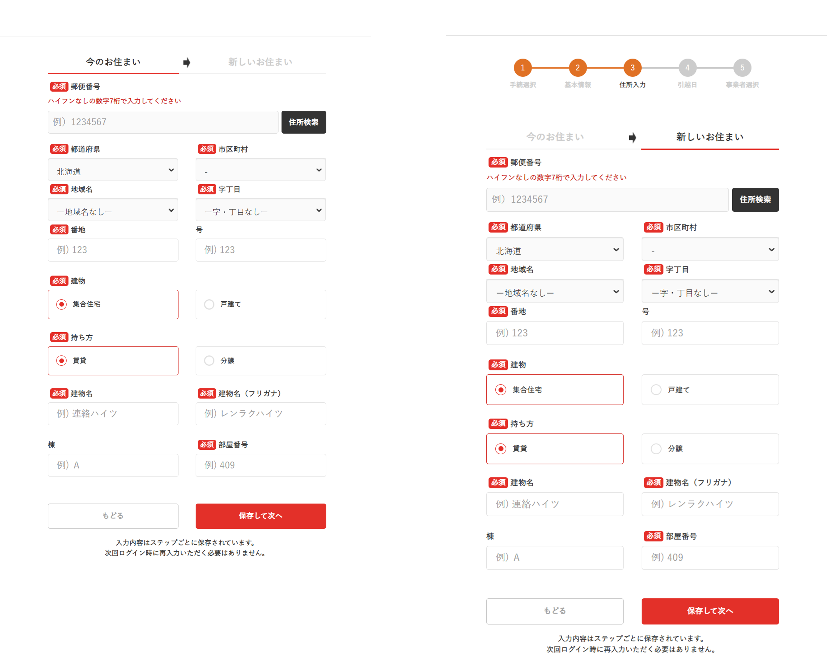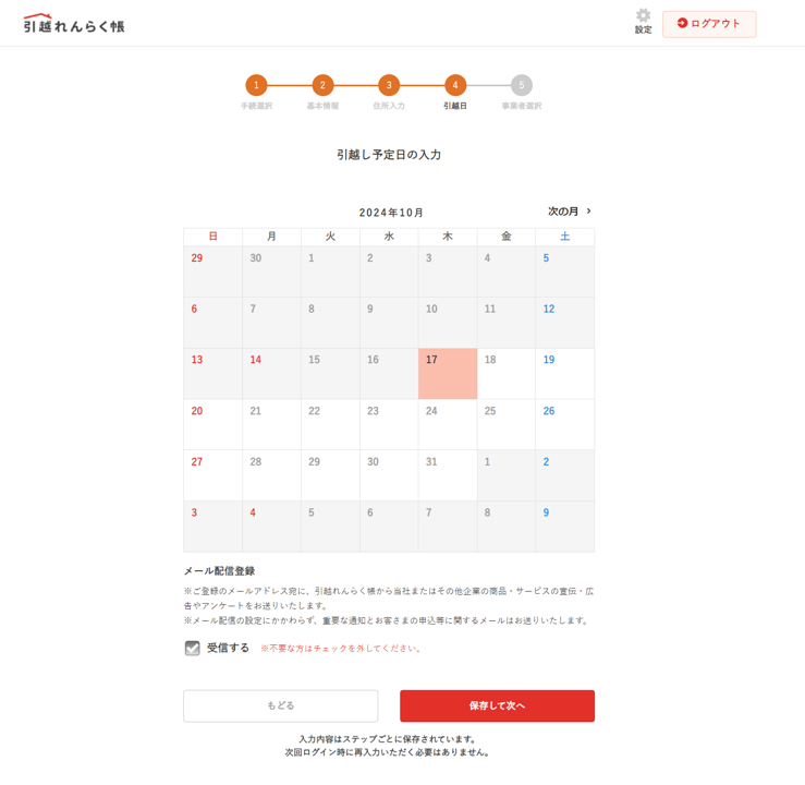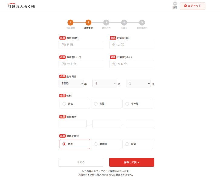 入力した情報は途中保存できるので、手続きの途中でいったん止める場合でも、次回入力する際にはそれまで入力していた内容が保存されます。