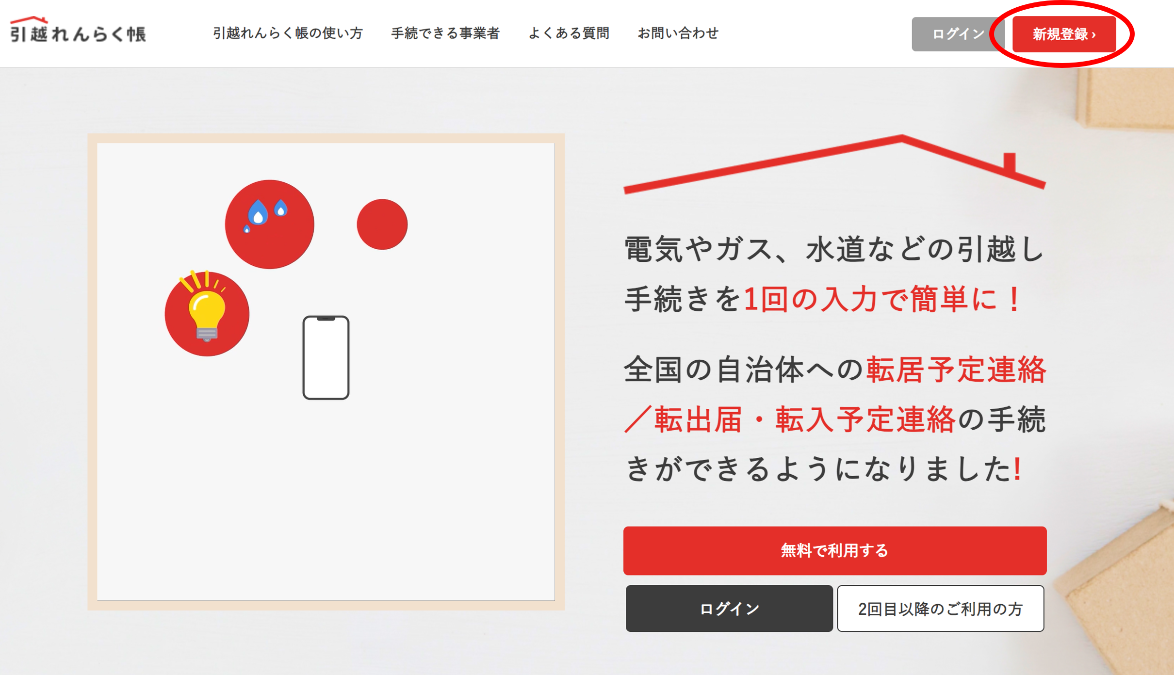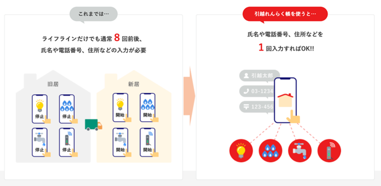 「引越れんらく帳」は、電気・ガス・水道などのライフライン手続きを、Web上でまとめて完了できるサービスです。