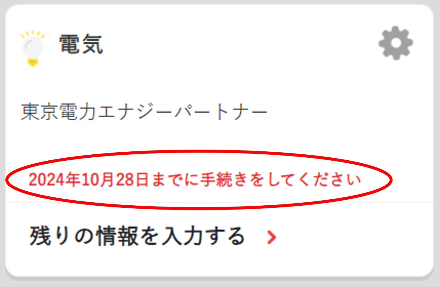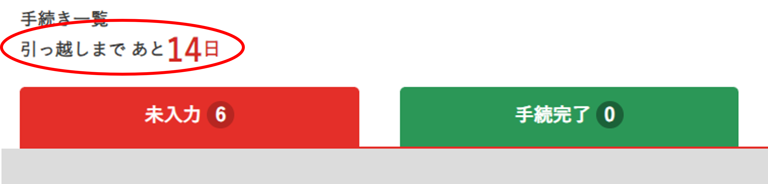 引っ越し日を設定しておくと、登録画面に、引っ越し日までの残数と、各事業所の手続き締切日が表示されるので、いつまでに手続きをすればよいかがわかります。
