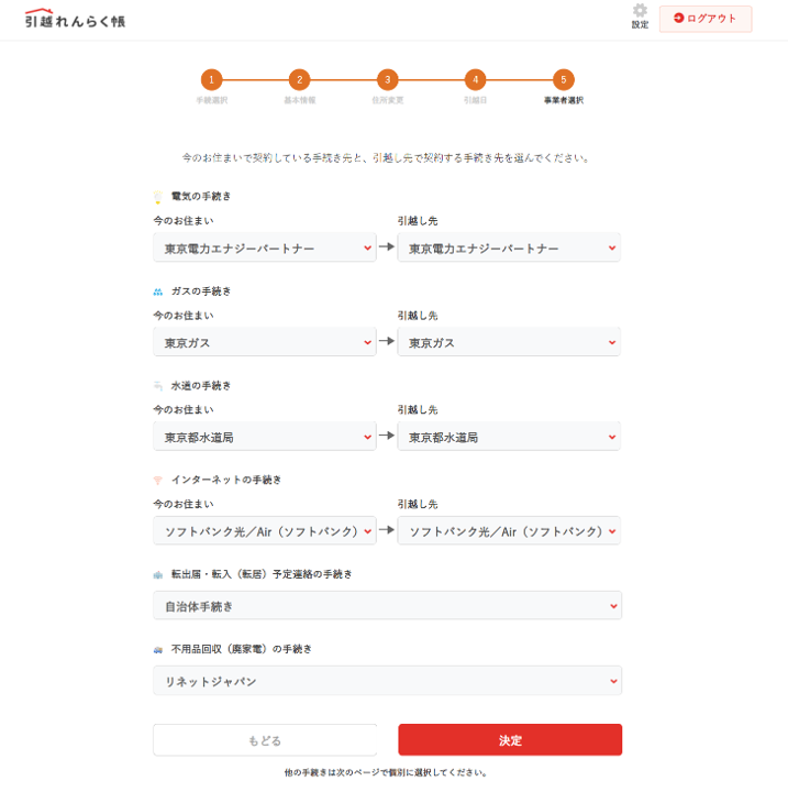 業種を選んだら、引越れんらく帳で手続きを済ませたい事業者の選択をします。引越し元で利用している事業者と、引越し先で利用する事業者をそれぞれ選びましょう。