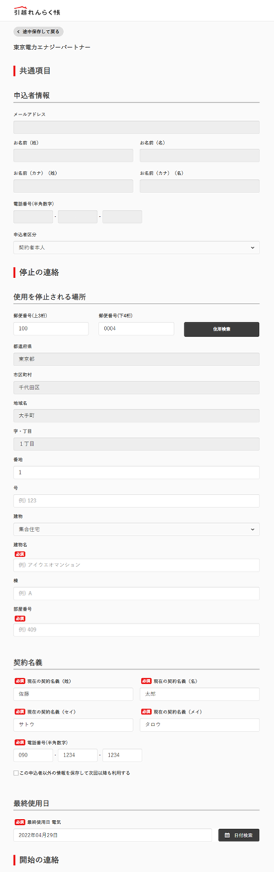 新規登録時に入力した情報が各事業者の手続きページに反映されているので、入力する手間が省けてとっても便利!