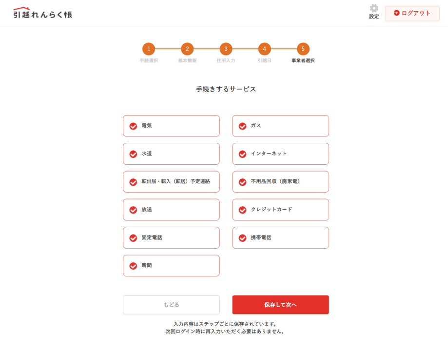 STEP3)引越れんらく帳で手続きするサービスを選ぶ