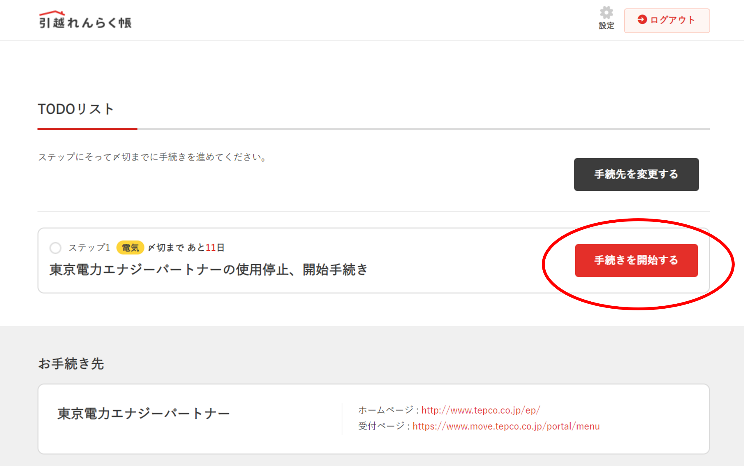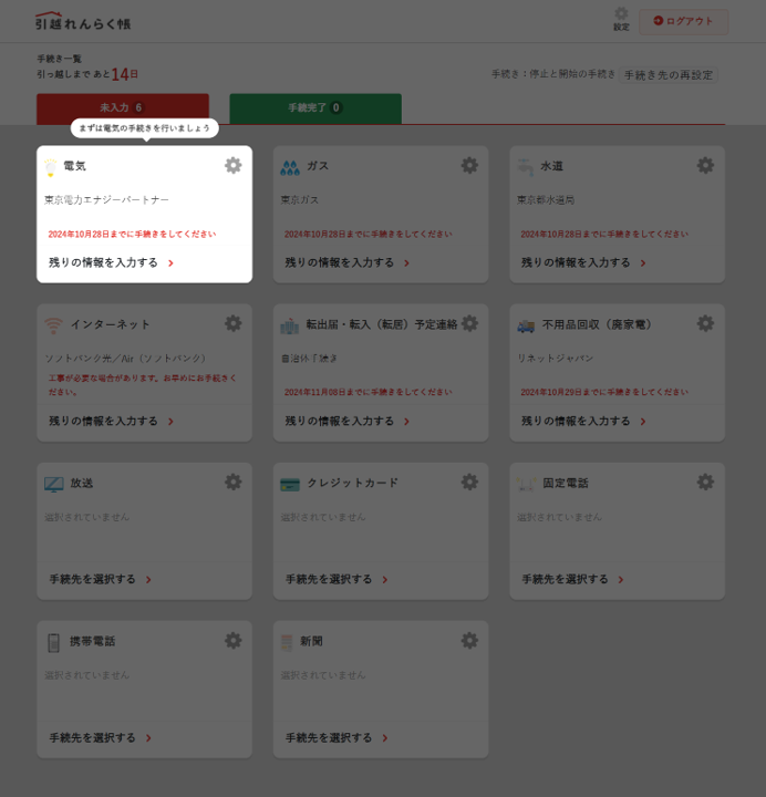 続いて、手続きするライフラインや事業所の設定です。一覧画面から、手続き先の「残りの情報を入力する」をクリックしましょう。手続き先を確認し、変更がなければ「手続きを開始する」をクリックしてください。
