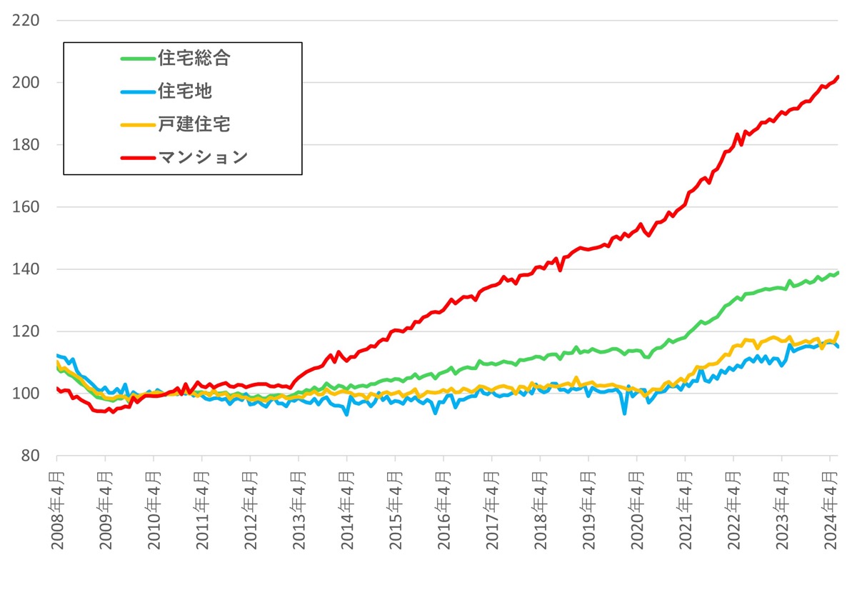 近年、不動産価格は上昇しています。不動産の価格動向が反映される不動産価格指数(2010年=100)は、2024年6月に総合138.9、住宅地115.0、戸建住宅119.7、マンション201.9となりました。