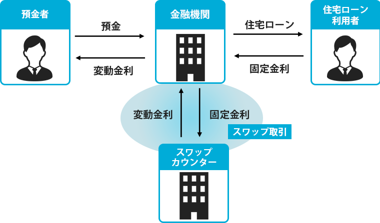 固定期間の金利水準は当該期間に対応する基準金利をベースに決まります。基準金利はスワップレートに連動しています。金融機関は短期金利で調達しており、短プラベースで貸し出す変動なら問題ありませんが、固定特約の場合将来の短期金利上昇のリスクをヘッジするため、下図の通りスワップを使って変動に転換する必要があるからです。