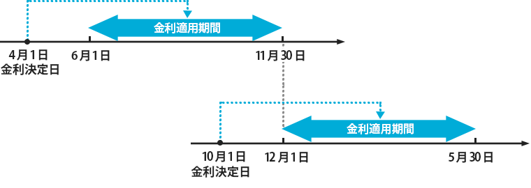 4月1日の金利が6月1日から11月末までの6ヶ月間適用され、10月1日の金利が12月1日から5月末までの6ヶ月間適用されます。