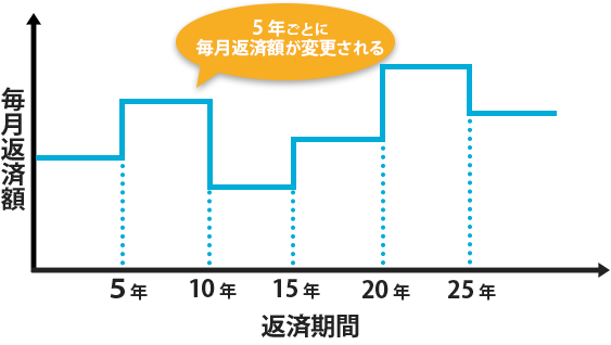 金利が変わってもすぐに毎月の毎月返済額(元利均等払いの場合の元本と金利の合計額)が変わるわけではありません。毎月返済額は5年に1度しか変更されず、毎月返済額中の金利部分のみが新しい金利によって変わります。例えば、金利が上昇した場合は毎月返済額の金利部分が増加し、それと同額元本返済部分が減少します。