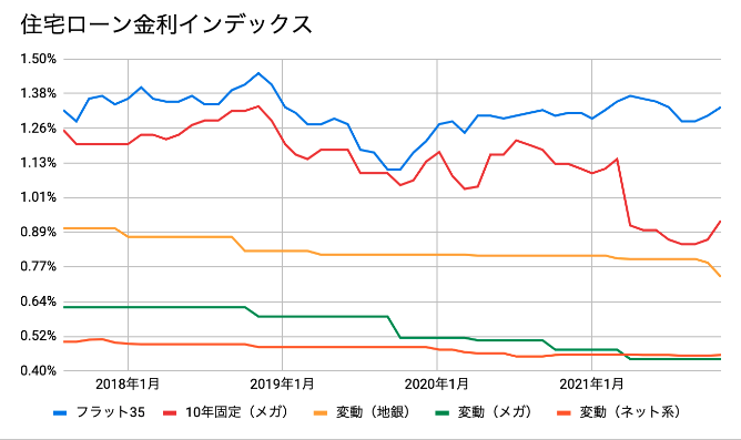 主要なネット銀行、メガバンク、地方銀行の変動金利、メガバンクの10年固定金利、フラット35の金利をそれぞれ平均した、住宅ローン金利インデックスの動きは下図の通りです。