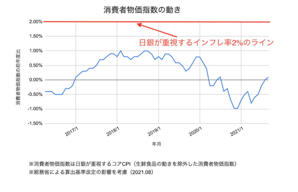 消費者物価指数は現在0%付近にあり、現状日本ではインフレが起こっているとはいえない状況です。
