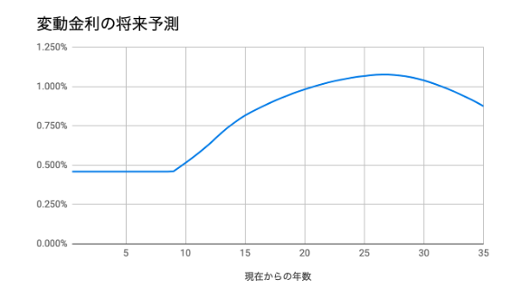 このグラフから、変動金利は今から10年後頃から徐々に上昇し、最大1.08%近辺まで上昇した後に低下する可能性があると読み取ることができます。