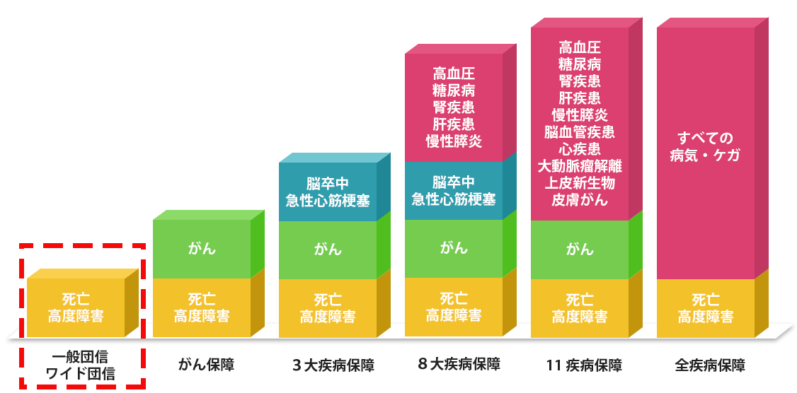 一般団信の保障内容は原則死亡保障と高度障害保障のみです。これらの状態以外の幅広い疾病リスクに対応するにはがん保障や3大疾病保障などの疾病団信に入る必要があります。