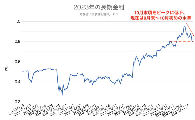 7月・10月と日銀が相次いで金融緩和政策を修正した影響から長期金利(10年国債利回り)は上昇基調となり、10月末頃には約10年ぶりとなる1.00%に迫りましたが、その後はアメリカの長期金利低下を受けて日本にも金利低下圧力がかかりました。背景には11月に入りアメリカ・FRBが利上げ(政策金利の引き上げ)を見送ったことや、インフレ率の低下が確認されたことが挙げられます。