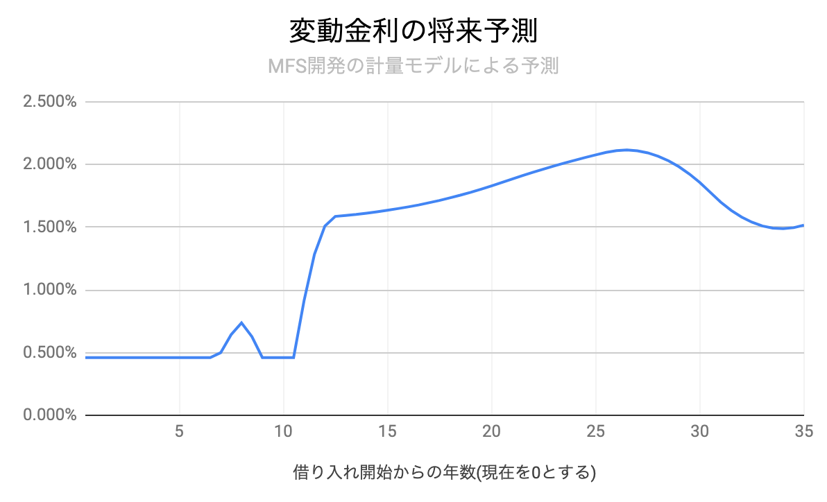 このグラフから、変動金利は今から10年後頃から徐々に上昇し、最大2%近辺まで上昇した後に低下する可能性があると読み取れますが、少なくとも向こう10年程度は大きな変化なく低金利が続くという予測になっています。