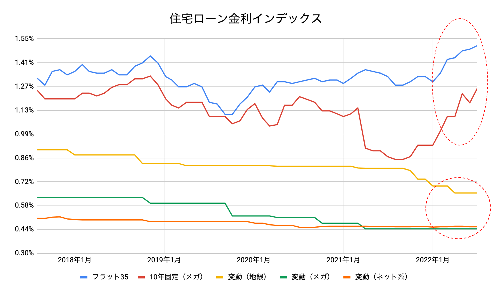 主要なネット銀行、メガバンク、地方銀行の変動金利、メガバンクの10年固定金利、フラット35の金利をそれぞれ平均した、住宅ローン金利インデックスの動きは下図の通りです。
