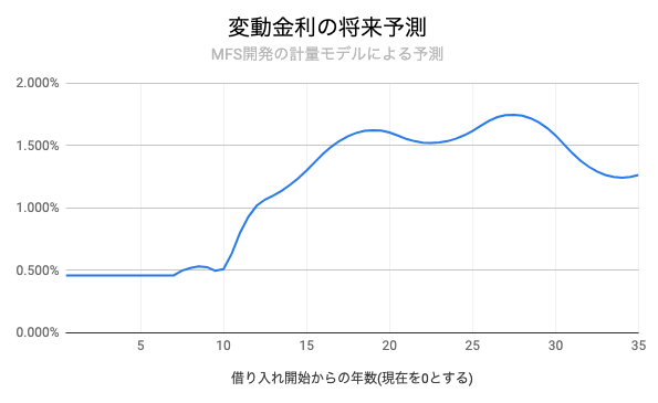 このグラフから、変動金利は今から10年後頃から徐々に上昇し、最大1.50%近辺まで上昇した後に低下する可能性があると読み取れますが、少なくとも向こう10年程度は大きな変化なく低金利が続くという予測になっています。