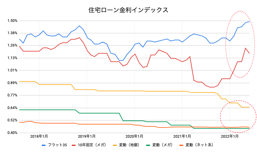 主要なネット銀行、メガバンク、地方銀行の変動金利、メガバンクの10年固定金利、フラット35の金利をそれぞれ平均した、住宅ローン金利インデックスの動きは下図の通りです。