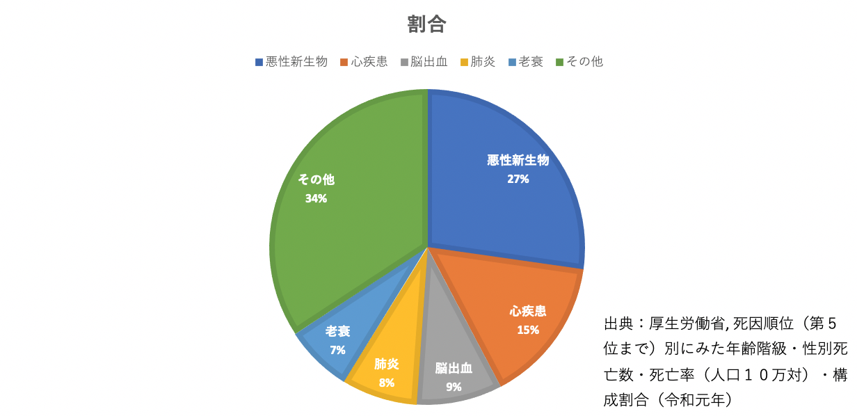 また、下記グラフの通り、日本人の死因のトップはがん(悪性新生物)で、次に心疾患、脳出血と3大疾病が続き、3大疾病で全体の約半分を占めています。