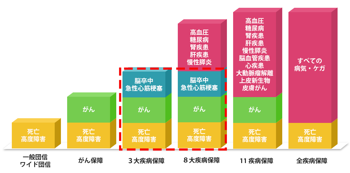 3大疾病保障は単体でも利用できますし、8大疾病保障とセットでも利用可能です。ただ、11疾病保障や全疾病保障には3大疾病保障が含まれていないので、注意が必要です。