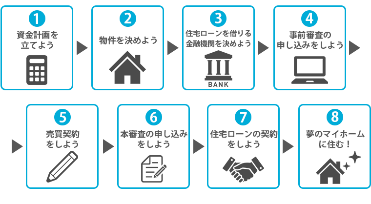 なお、物件が決まっても売買契約を結ぶためには住宅ローンの事前審査の承認を得ている必要があります。事前審査には時間がかかるので、物件探しと同時に住宅ローンを借りる金融機関探しも始めましょう。